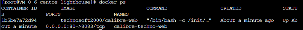 使用docker ps查看容器启动结果,下图表明calibre-web启动成功。