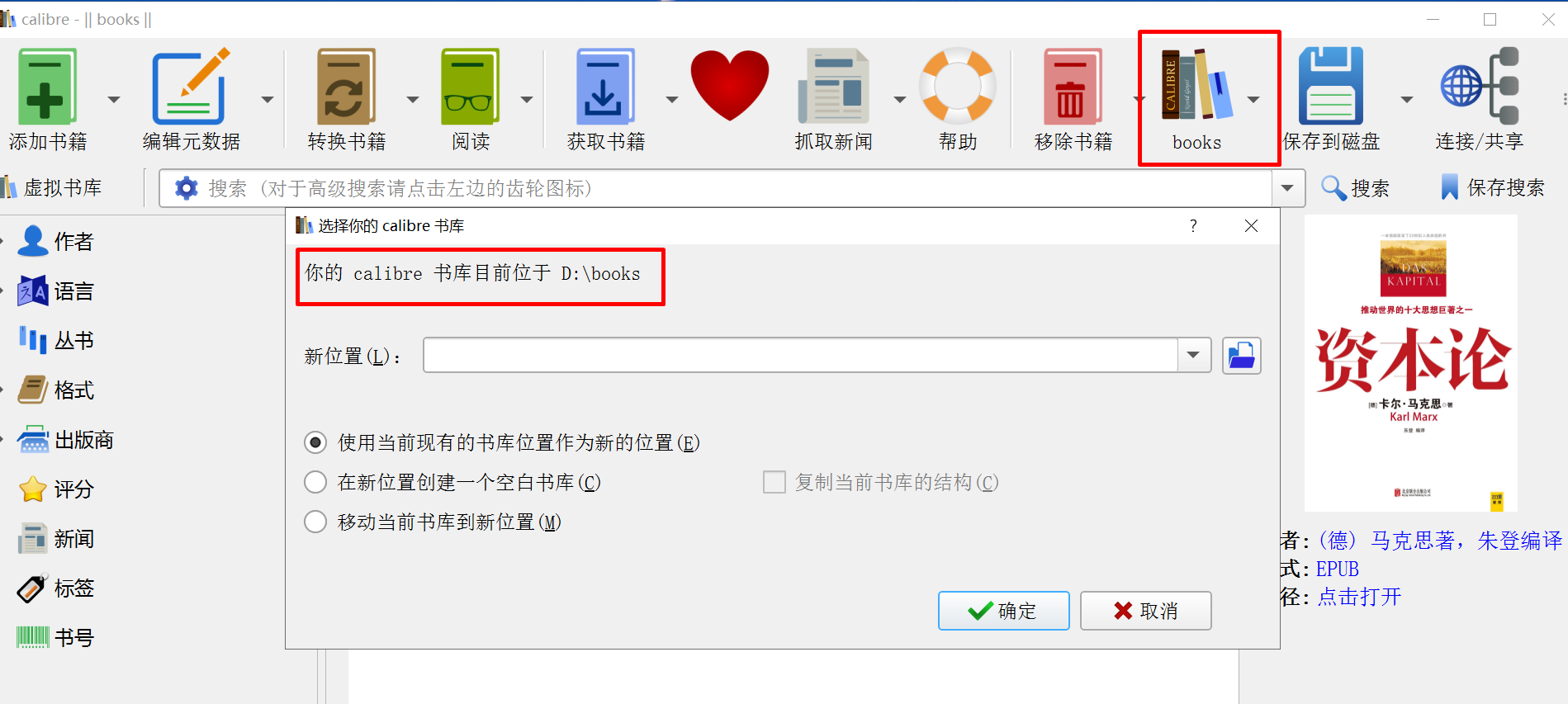 要启动calibre-web,有一个关键的依赖是metadata.db文件,没有这个文件calibre-web无法正常运行。打开本地电脑calibre客户端软件,查看书库的目录,如下图所示为D:\books。
