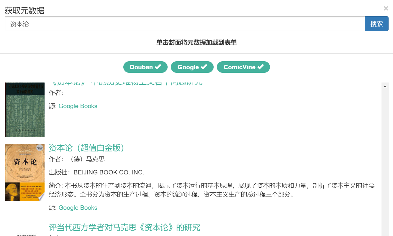如果觉得电子书自带的图书信息不对,还可以到douban,google等网站上获取书籍元数据,选择自己认为合适的元数据更新书籍即可。