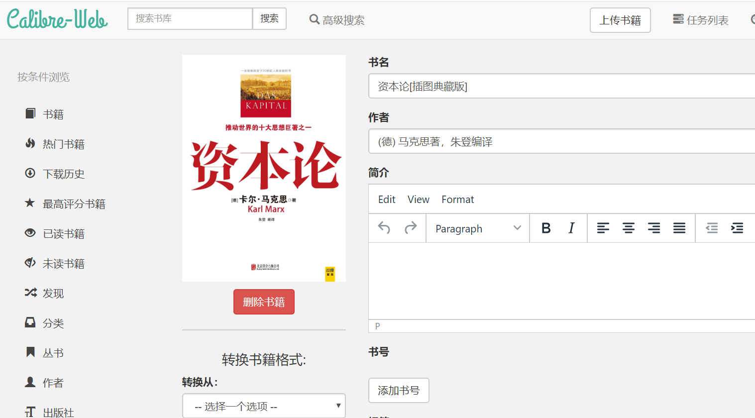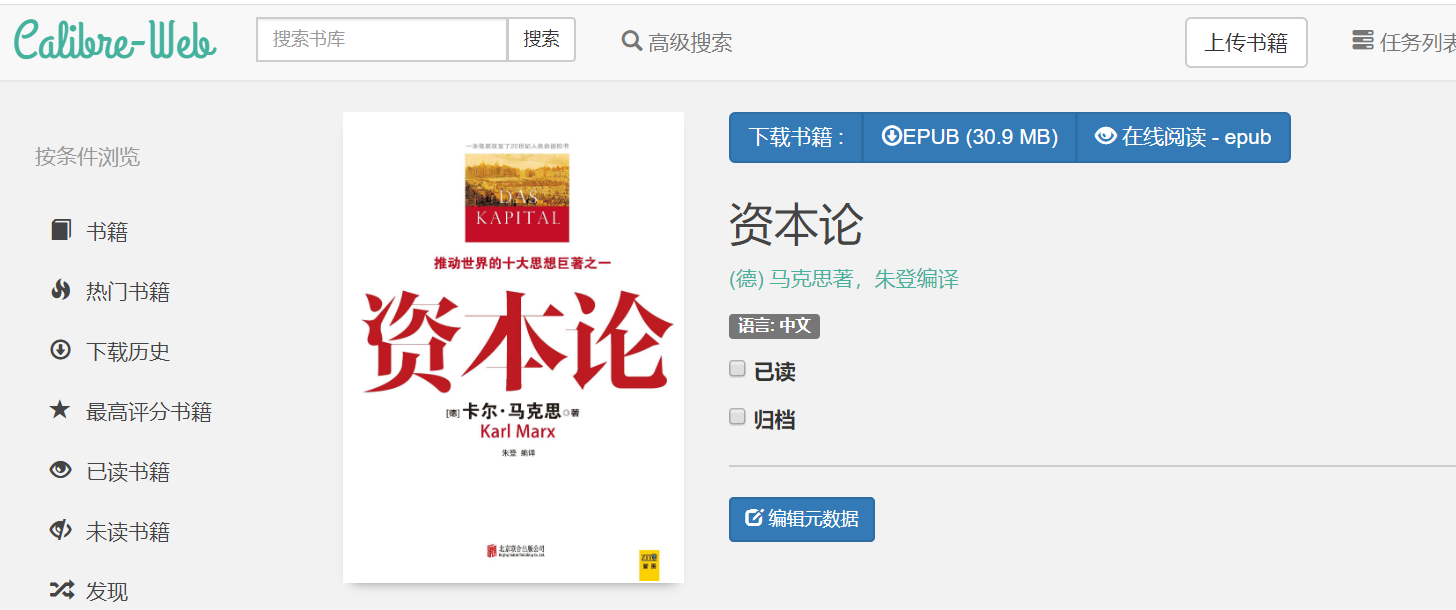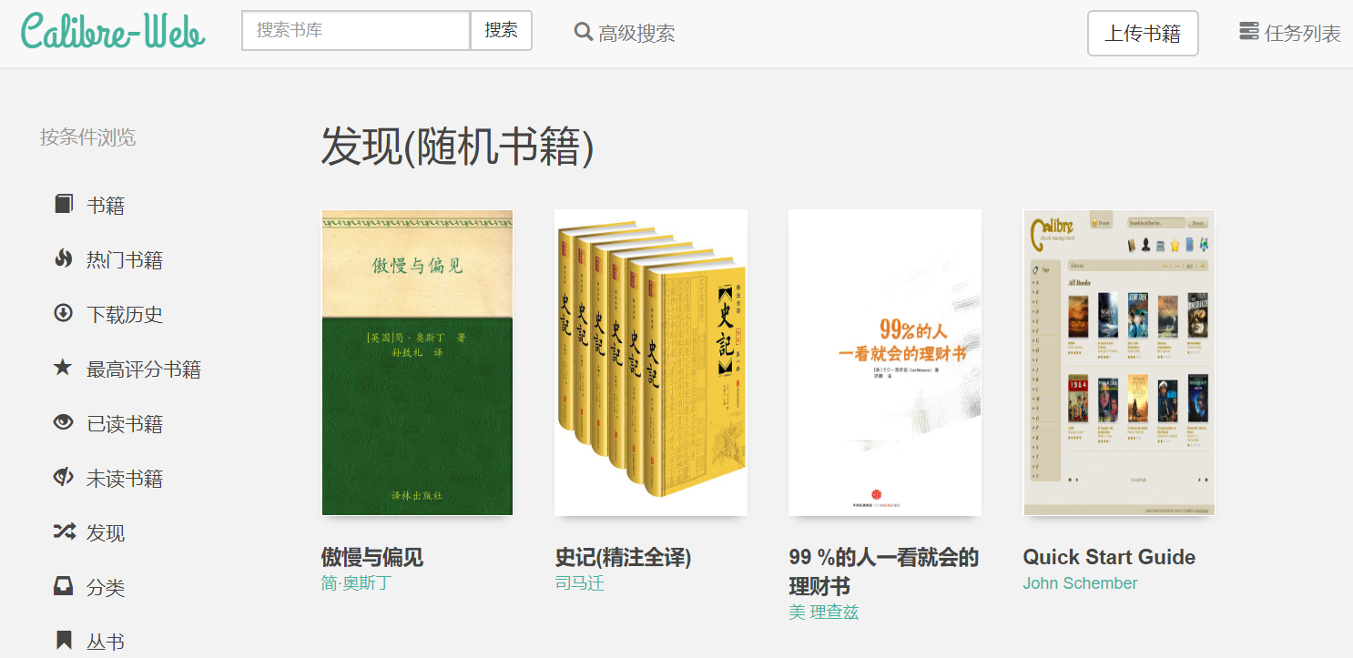 经过多年的积累,电脑里保存了很多电子书,保存在硬盘上非常不利于管理和查找。那么说到电子书管理工具,个人认为最好用的非calibre莫属。之前在电脑上已经安装了calibre客户端,但是换一台电脑使用还需要再次安装calibre,而且多设备之间书籍的同步也比较麻烦。因此为了提升阅读体验,准备搭建个人在线图书馆,把自己曾经下载的电子书进行集中管理。经过搜索,发现有calibre-web这样一个工具,可以提供calibre的在线服务,这真是再合适不过了。