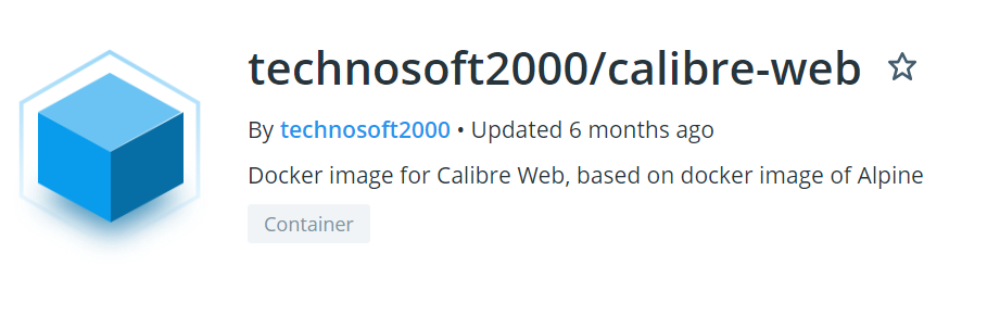 在dockerhub上我们找到calibre-web的镜像,这里我们使用technosoft2000/calibre-web这个镜像。因为该镜像相比于calibre-web官网docker镜像linuxserver/calibre-web,集成了电子书格式转换、在线预览等功能,是目前功能最为强大的calibre-web docker镜像。