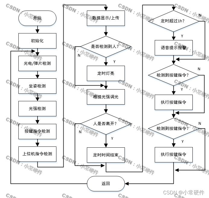 系统的软件实现过程中首先要进行的系统初始化,初始化结束后开始进行光电检测、坐姿检测,光强检测,按键指令检测和上位机指令检测,判断是否检测到人,是则定时灯亮并根据光强调光,判断人是否离开,是则结束定时时间,判断定时是否超过1h,是则语音提示报警,判断是否检测到按键指令,是则执行指令。