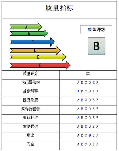 质量指标是一种非常实用的方法,可以在软件程序发布前甚至在系统测试之前对软件代码的质量进行量化概述。该指标结合了最著名的代码质量度量项,通过公司现有的代码检测工具定义了它们是如何测量的,以及如何判断质量的高低。按照得到的分数,将软件系统依次标记为A(优秀质量)到F(质量差)多个不同的质量等级。