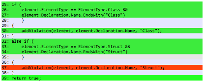 下面的C#代码展示了用代码覆盖率检测工具输出的一个简单示例。每一行颜色为“绿色”的代码都经过至少一次测试,而“红色”行的代码没用经过任何测试。