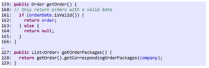 抽象解释工具将在第228行标记一个可能出现的空指针解引用缺陷,因为函数“get Order”会在订单没有有效日期的情况下返回NULL。如果发生这种情况,将抛出异常,可能导致程序崩溃。