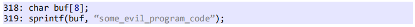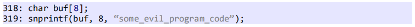 在第319行,一个非常长的字符串被写入一个名为“buf”的数组,该数组只能容纳8个字符。不适合“buf”的字符被保存在其他地方,可能会覆盖应该执行程序的代码。通过利用这个漏洞,攻击者可以运行另一个程序,而不是运行的本来的程序。修正后的例子是下图。