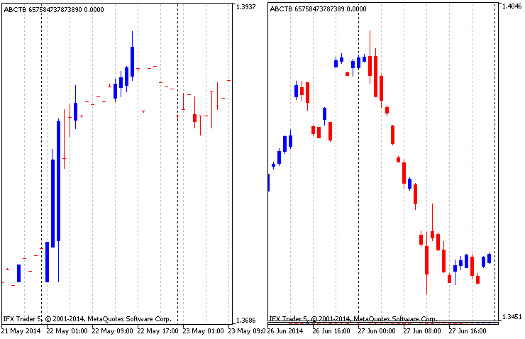 由于现代构造结合了四种不同价格类型的三线突破图表,它可以很自然地找到价格之间的差异。为了避免它,及时同步数据是必需的。价格同步带来两个变化: 完整 (图例. 2 右侧) 和局部 (图例. 2 左侧)。完整同步代表一个过滤的局部, 其中所有数据绘制在图表上,而且缺失数据被设置中的指定优选价格替代。在完整同步模式中,缺失数据被简单地省略,并且仅绘制数据完整的烛条。