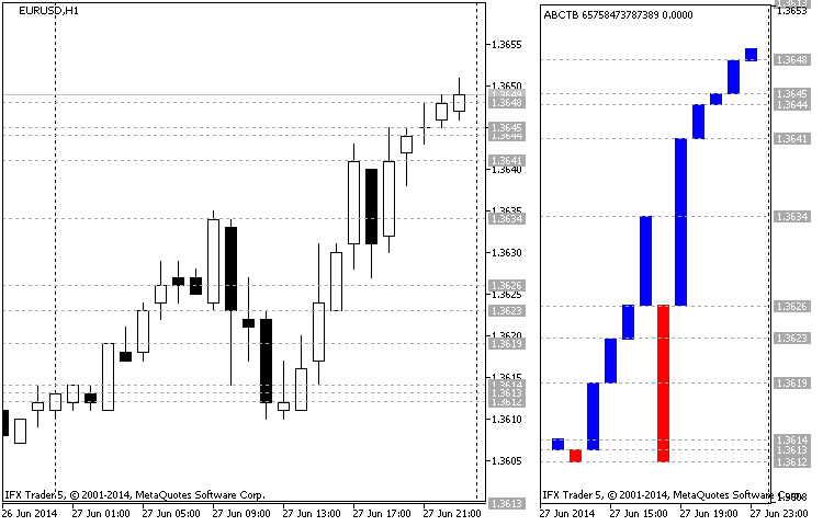 图例. 1 在左侧呈现了一个蜡烛条图表,以及右侧的三线突破图表。这是 EURUSD 图表, 时间帧为 H1。图表的开始日期是 27.06.2014 起始价位 1.3613 (烛线的收盘时间 00:00), 则烛线 (01:00) 收盘于 1.3614, 形成了三线突破图表的第一根阳线。随后的空头烛线 (02:00) 形成一个阳线, 收盘于 1.3612 (收盘价低于之前的最低)。