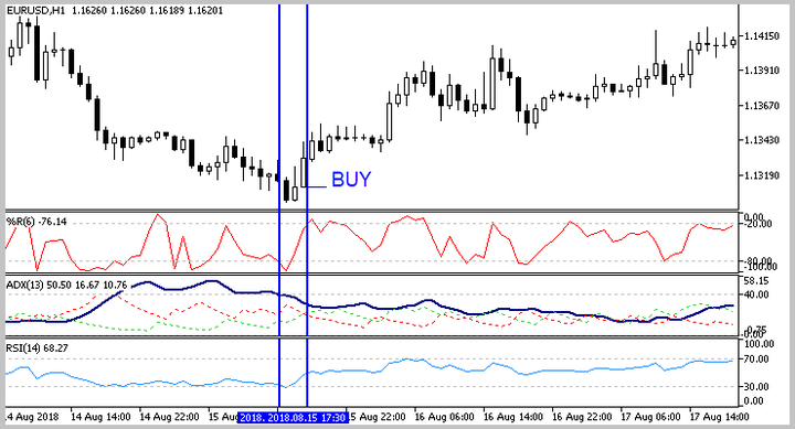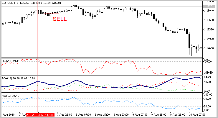 卖出则是该信号的镜像。 WPR 指标向下超过超买等级 -20,RSI 应超过等级 30 的超卖区域。 ADX 控制横盘的存在,就像买入时一样。