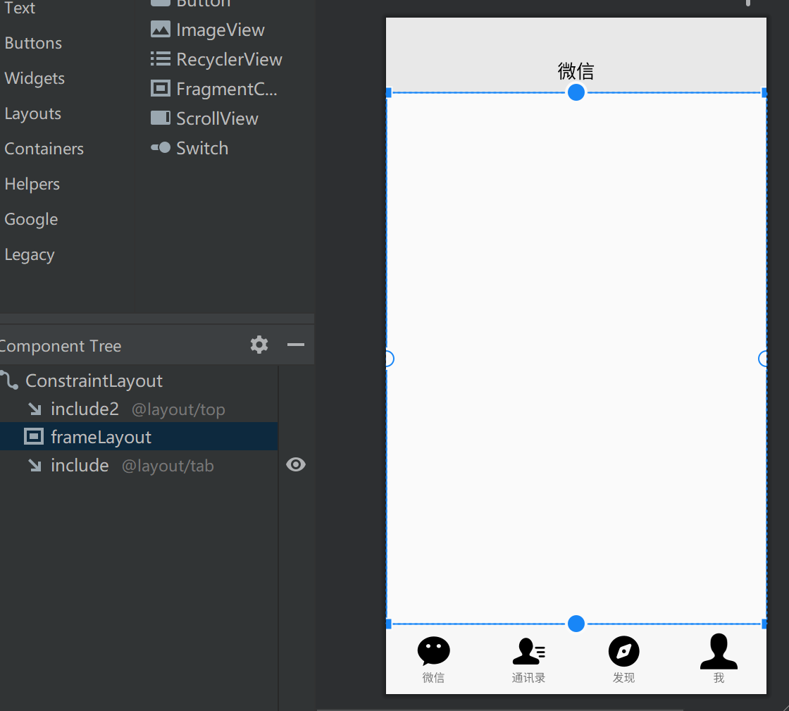 @Overridepublic void onClick(View view) {switch (view.getId()) {case R.id.LinearLayout1:select(1);break;case R.id.LinearLayout2:select(2);break;case R.id.LinearLayout3:select(3);break;case R.id.LinearLayout4:select(4);break;default:break;}}private void select(int i) {TextView textView_top = findViewById(R.id.textView_top);FragmentTransaction transaction = manager.beginTransaction();hideall(transaction);switch (i) {case 1:transaction.show(fragment1);textView_top.setText("微信");rebu();imageView1.setImageResource(R.drawable.ic___wx_this);textView1.setTextColor(0xFF07C060);Log.d("show","case1");break;case 2:transaction.show(fragment2);textView_top.setText("通讯录");rebu();imageView2.setImageResource(R.drawable.ic___txl_this);textView2.setTextColor(0xFF07C060);Log.d("show","case2");break;case 3:transaction.show(fragment3);textView_top.setText("发现");rebu();imageView3.setImageResource(R.drawable.ic___fx_this);textView3.setTextColor(0xFF07C060);Log.d("show","case3");break;case 4:transaction.show(fragment4);textView_top.setText("我的");rebu();imageView4.setImageResource(R.drawable.ic___me_this);textView4.setTextColor(0xFF07C060);;break;default:break;}transaction.commit();}