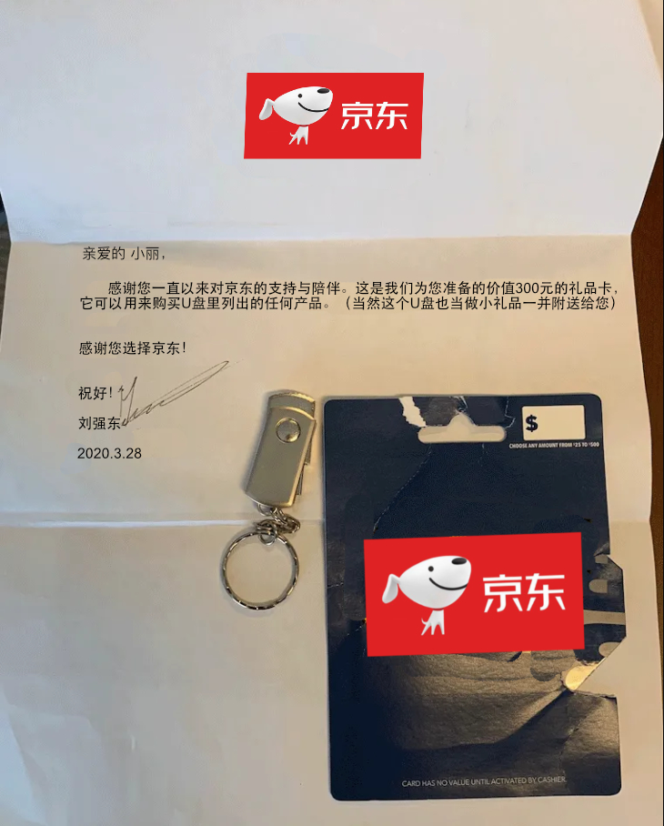 “就今天,刚收到个快递,京东给我寄的。一张300块钱的礼品卡,还送了我个U盘。这300块钱可以用来买U盘里面列表里的东西。”