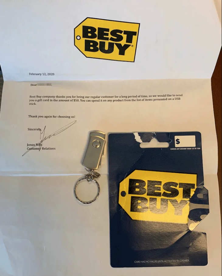 由一家名叫Trustwave的安全公司发布的一个真实案例。他们的一位客户收到了一个包裹,显示是百思买(Best Buy)给到其忠实客户的50美元礼品卡。