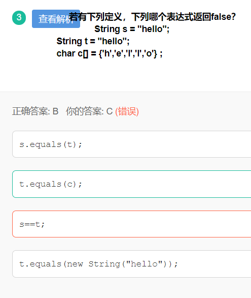 C选项是引用地址的比较,同上也属于常量池的同一个字符串地址,所以相等返回true。