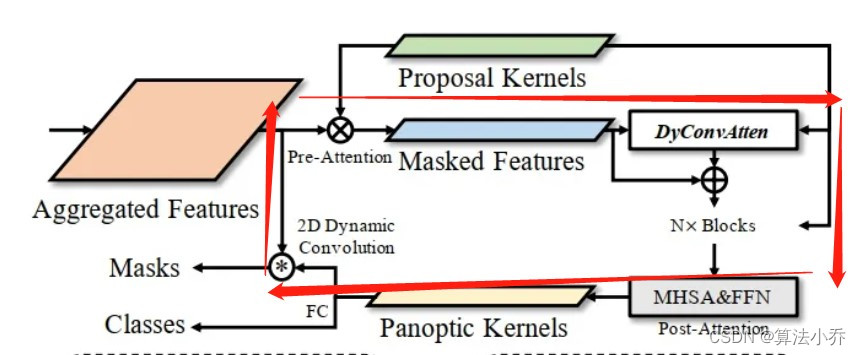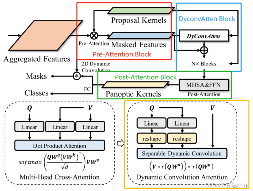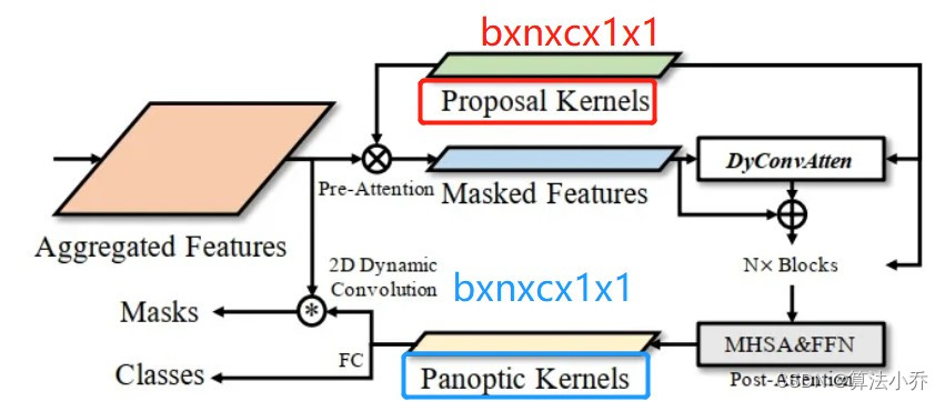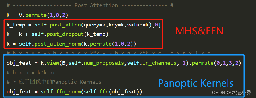 在后注意力模块中,采用多头自注意力(query=O,key=O,value=O)得到MO shape为[b,n,c], 然后 MO 和 前馈神经网络FFN 并通过来生成全景Kernels Output shape为[b,n,1,c],1=k*k,k=1.
