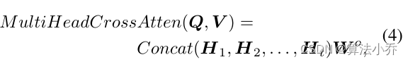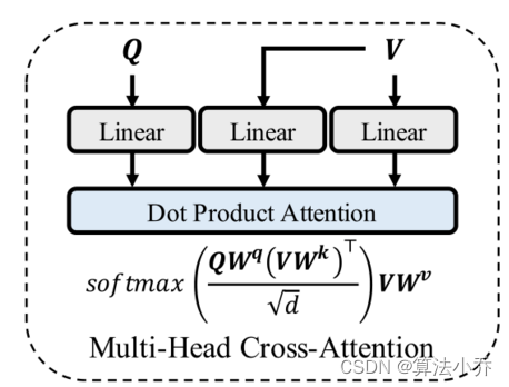 上图为传统的多头交叉注意力模块,将输入 Q和V sape[n,c] ,拆分为t个head,进行交叉注意力计算,公式如下: