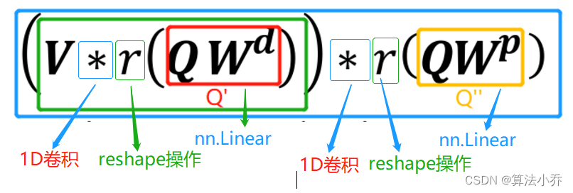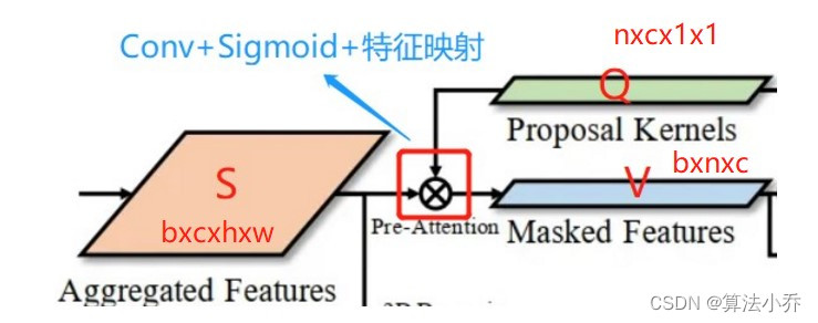 Q来自于上面Per-Attention中的Proposal Kernels 其shape为[n,c,1,1] -> expand[b,n,c,1,1] -> reshape [b,n,c] ,V 为 Per-Attention中得到的映射矩阵 其shape为[b,n,c]。 如上图,Q分别进行两个全连接得后到两个结构Q' (作为第一个卷积的卷积核 )和 Q'' (作为第二个卷积的卷积核)。