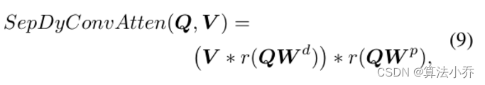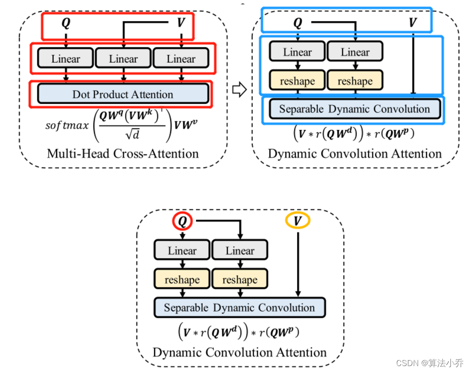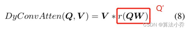 注意!! 公式中的Q 也就是后面动态卷积注意力(Dynamic Convolution Attention )Decoder中的Q。它来自于上述2D卷积的卷积核 shape [n,c,1,1] -> reshape [n,c], 与V的shape一致(不考虑batch)。