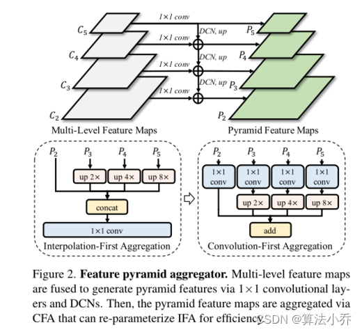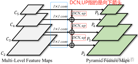 对于C2到C5,首先采用1x1的卷积对多级特征图进行通道压缩,然后C3到C5分别进行DCN和upsample操作,从上到下的特征融合,分别得到P5、P4、P3、P2.