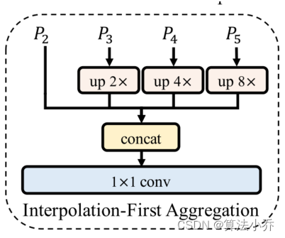 首先P3到P5,分别上采样到P2大小,然后Concat通道合并,最后通过1x1卷积进行通道间的特征融合。