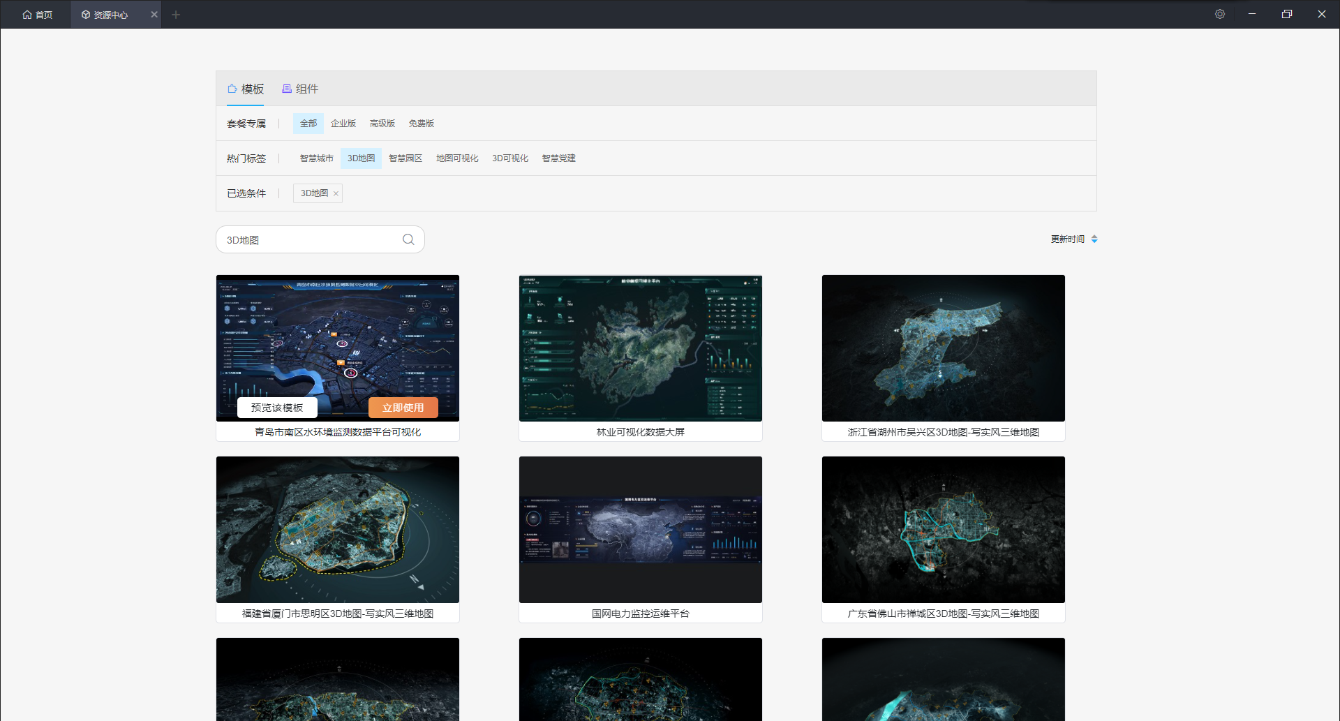 山海鲸可视化内置的资源中心包含了各个行业上百种大屏模板,而3D地图模板是其中最丰富的一类,只要在软件内一键下载即可使用。如有需要,还可以对3D地图中的地面特效、模型标记等进行设置。