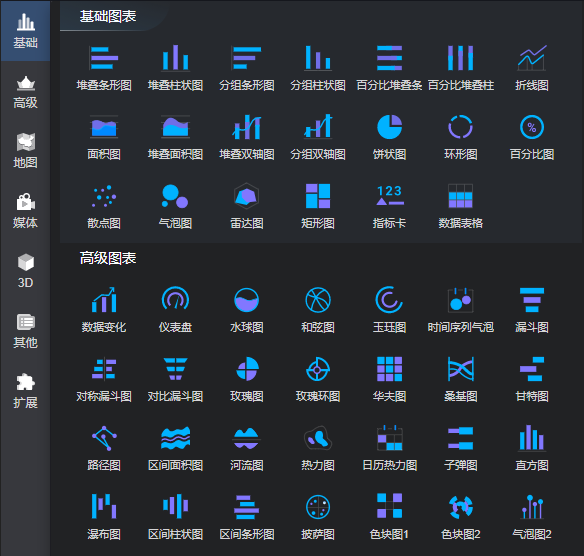 山海鲸可视化提供了八十多种各类数据可视化相关组件,这些组件可以进行数据联动、样式编辑、交互设置等操作,帮助用户构建炫酷的数字孪生大屏。