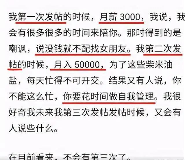 一类是屌丝男性,之所以骂大约是挫伤了他们隐藏在心底的自尊。他们大都被月薪5万刺痛,毕竟如此高的收入,都是极个别人群了。