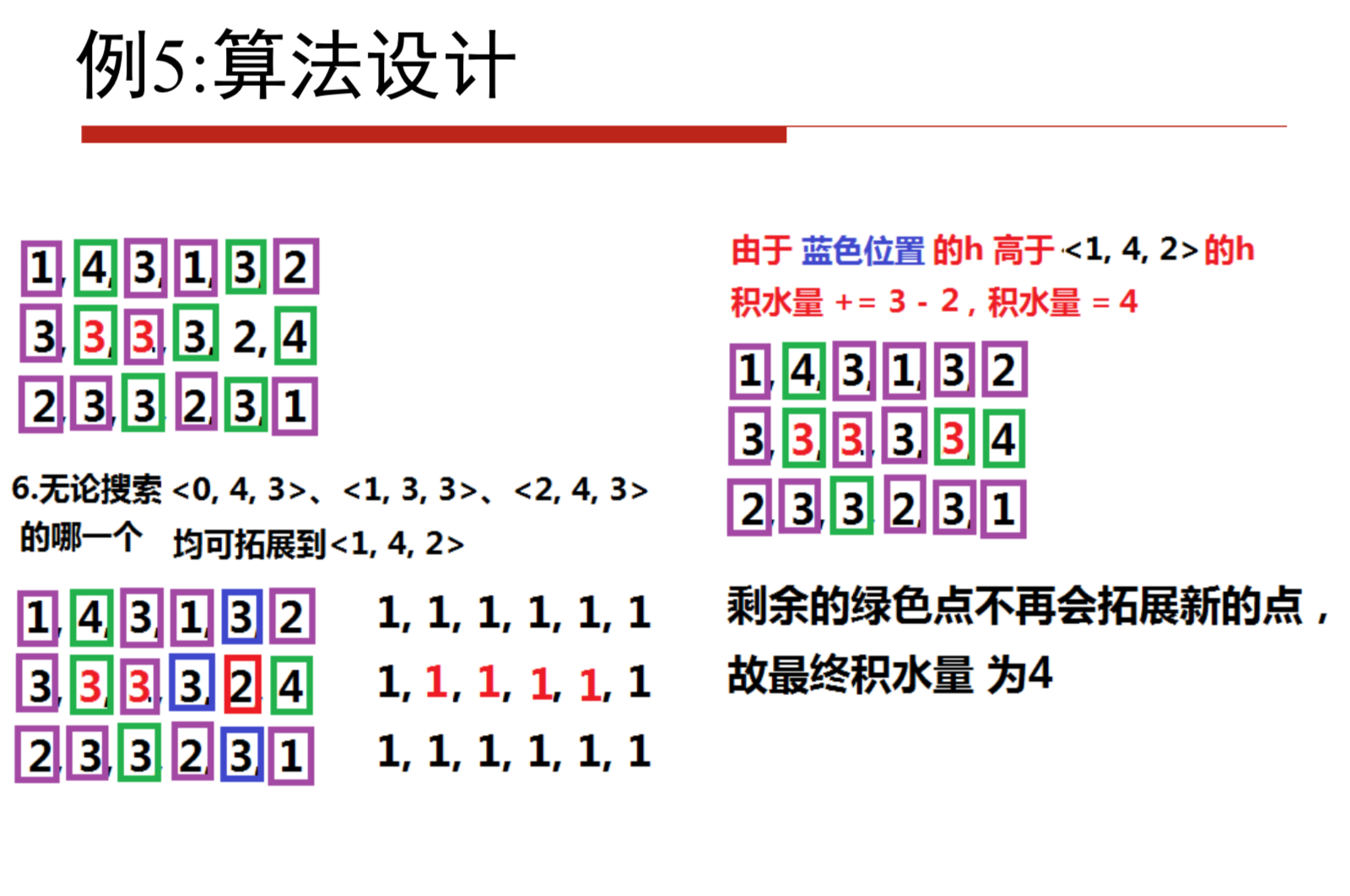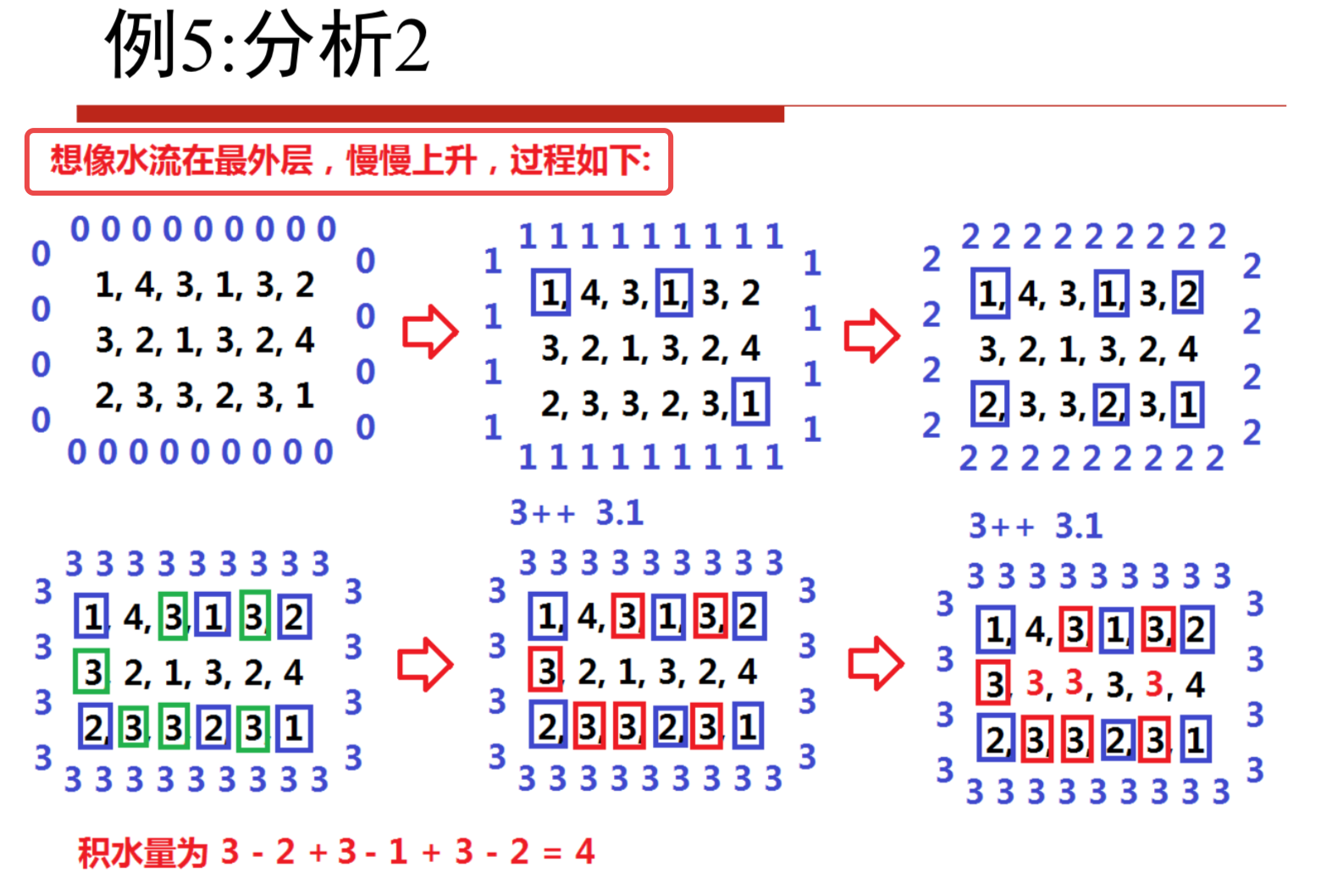 2. 若大于零,那么周围的cell就有积水: 因为cell已经是外围最低, 所以内部更低的, 一定有积水.