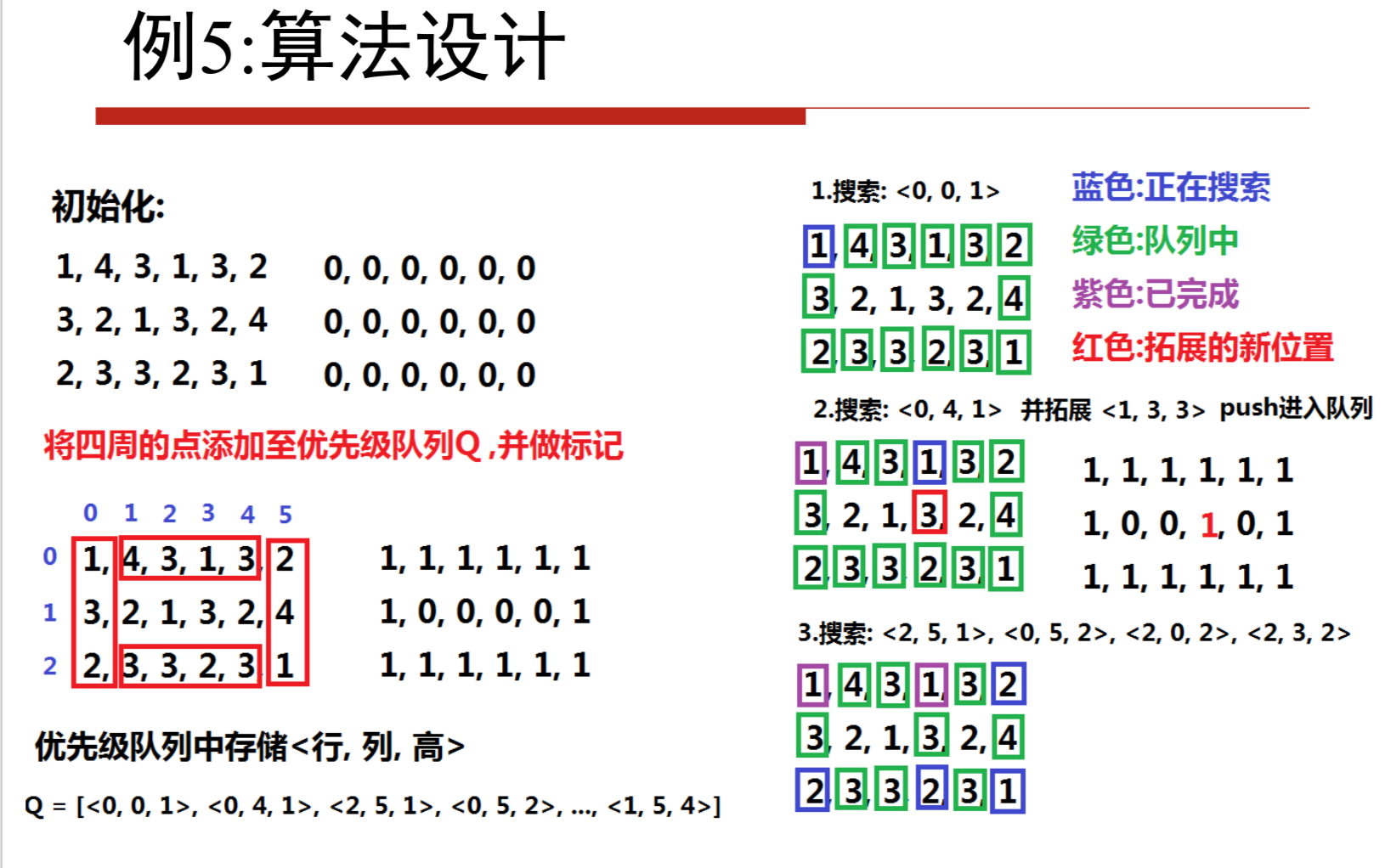 因为对整个矩阵而言,整个最外侧的一层墙会决定整个矩阵的盛水多少,所以将最外层的墙建立最小堆进行遍历,并且可以想象
