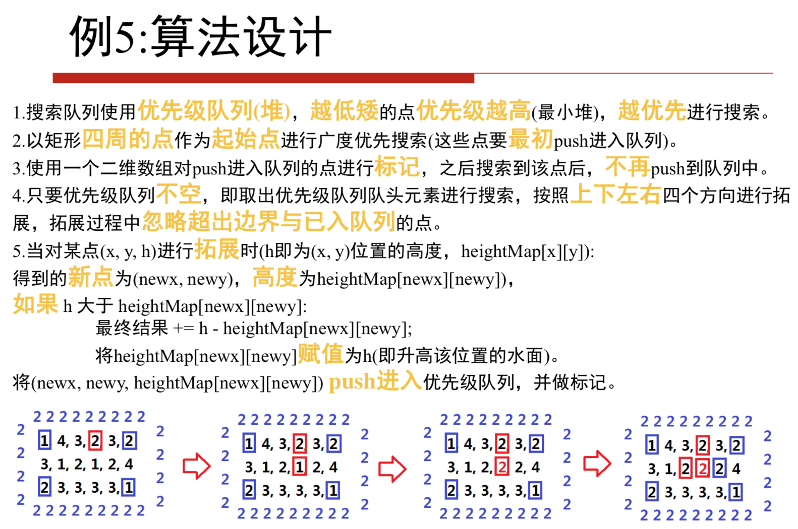 它邻居的新的墙,add到堆,并且高度是当前max(max(heightMap[r][c], height[i][j]),并且为了避免遍历中产生环,设