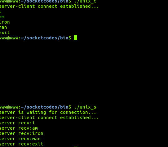 {int serFd,serConFd;int cli_len, nBytes;struct sockaddr_un serAddr;struct sockaddr_un cliAddr;char msg[MAX_SIZE];unlink(SOCKET_STR);serFd = socket(AF_LOCAL, SOCK_STREAM, 0);memset(&serAddr, 0, sizeof(struct sockaddr_un));serAddr.sun_family = AF_LOCAL;strcpy(serAddr.sun_path, SOCKET_STR);bind(serFd, (struct sockaddr*)&serAddr, sizeof(struct sockaddr_un));listen(serFd, SOCKET_BACKLOG);cli_len = sizeof(struct sockaddr_un);printf("server is waiting for connection...\n");serConFd = accept(serFd, (struct sockaddr*)&cliAddr, &cli_len);printf("server-client connect established...\n");while(1){memset(msg, 0, MAX_SIZE);nBytes = read(serConFd, msg, MAX_SIZE);if (nBytes>0){printf("server recv:%s\n", msg);if (!strcmp(msg, EXIT_STR)) break;}}close(serConFd);unlink(SOCKET_STR);