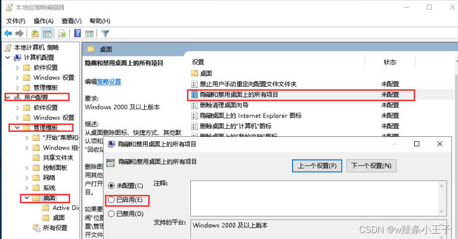 用户配置—>管理模板—>桌面—>隐藏和禁用桌面上的所有项目