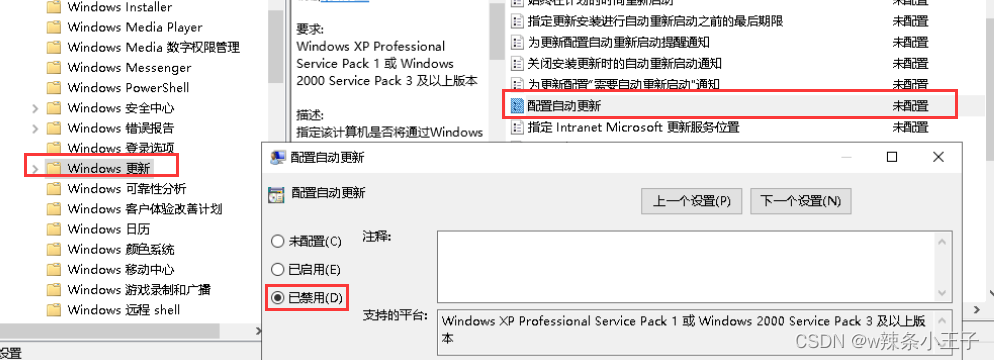 计算机配置—>管理模板—>Windows组件—>Windows更新—>配置自动更新