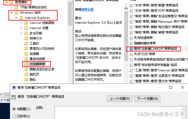 用户配置—>管理模板—>Windows组件—>Internet Explorer-->浏览器菜单—>禁用在新窗口中打开菜单选项