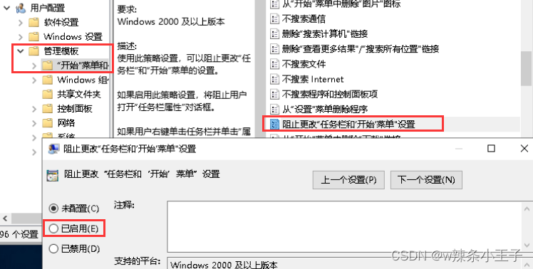 用户配置—>管理模板—>开始菜单和任务栏—>阻止更改任务栏和菜单设置