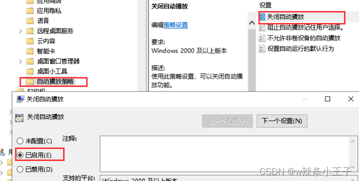 计算机配置—>管理模板—>Windows组件—>自动播放策略—>关闭自动播放
