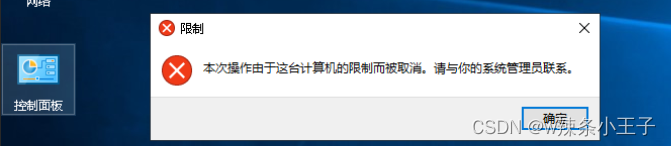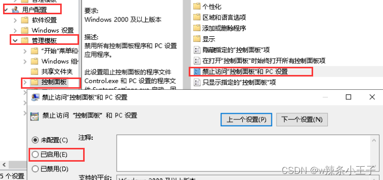 用户配置—>管理模板—>控制面板—>禁止访问控制面板和PC设置