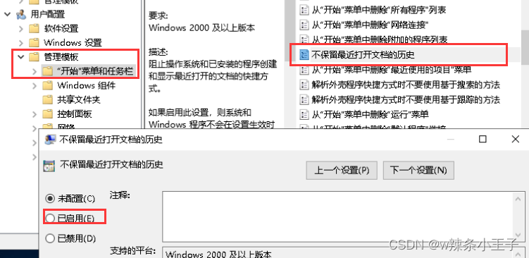 用户配置—>管理模板—>开始菜单和任务栏—>不保留最近打开的文档历史
