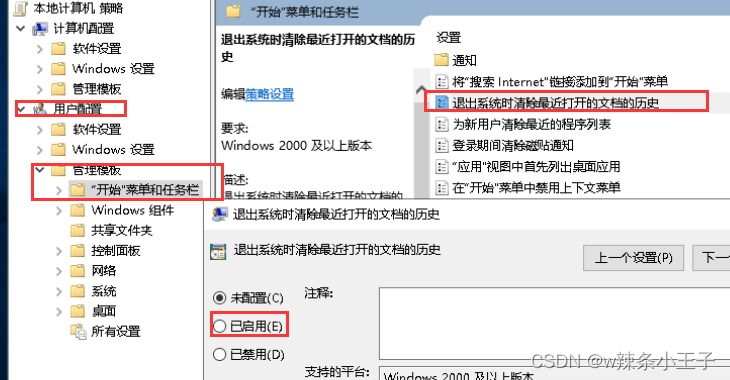 用户配置—>管理模板—>开始菜单和任务栏—>退出系统时清除最近打开的文档历史