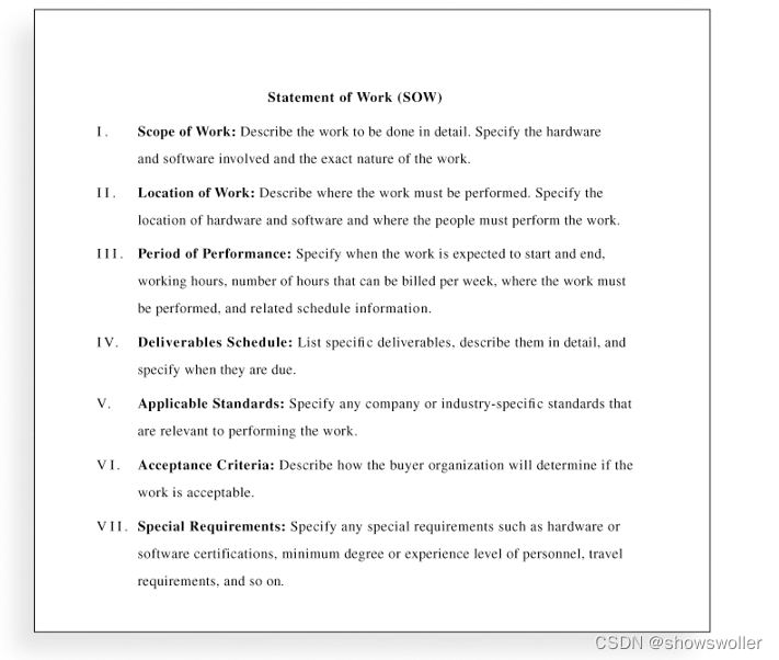如果SOW作为合同的一部分,仅描述特定合同所需的工作,则称为合同工作说明书