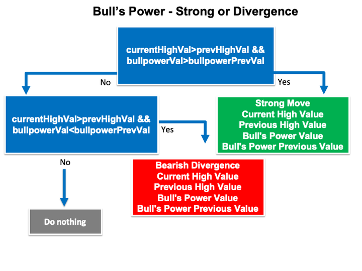 基于该策略,赫兹期货量化需要评估四个值来获得一个信号,通知我们是否存在强劲走势或背离,这些值是当期高点、前期高点、牛市力量、和前前牛市力量。 如果当期高点高于前期高点,当期牛市力量值高于前期,我们视其为强劲走势的信号。 若是另一种情况下,如果当期高点高于前期高点,而当期牛市力量值低于前期值,我们视其为看跌背离的信号。