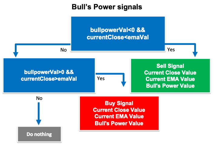 基于该策略,赫兹期货量化需要创建一个交易系统,在每次跳价时检查四个数值,它们是当期牛市力量、零轴、当期收盘价、和当期指数移动平均线。 我们需要判定当期牛市力量是否低于零轴,同时如果当期收盘价低于指数移动平均线,我们要求智能系统在图表上返回含有以下数值的注释信号,且每个数值都在单独的行中: