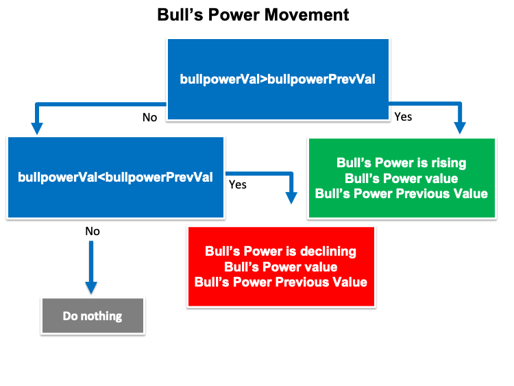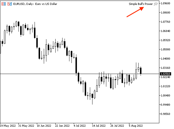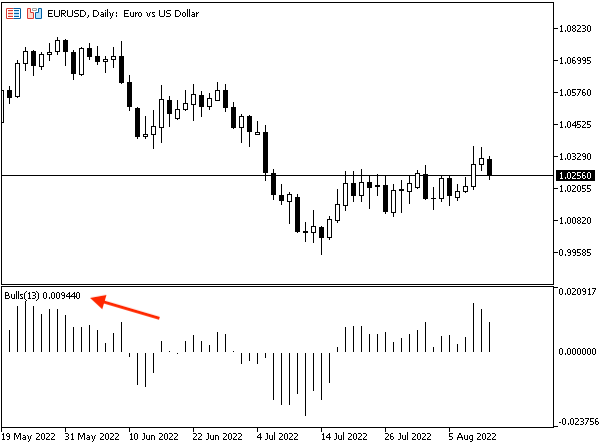 //+------------------------------------------------------------------+ //| Simple Bull's Power.mq5 | //| Copyright 2022, MetaQuotes Ltd. | //| https://www.mql5.com | //+------------------------------------------------------------------+ #property copyright "Copyright 2022, MetaQuotes Ltd." #property link "https://www.mql5.com" #property version "1.00" //+------------------------------------------------------------------+ void OnTick() { double bullpowerArray[]; ArraySetAsSeries(bullpowerArray,true); int bullpowerDef = iBullsPower(_Symbol,_Period,13); CopyBuffer(bullpowerDef,0,0,3,bullpowerArray); double bullpowerVal = NormalizeDouble(bullpowerArray[0],6); Comment("Bull's Power Value is ",bullpowerVal); } //+------------------------------------------------------------------+
