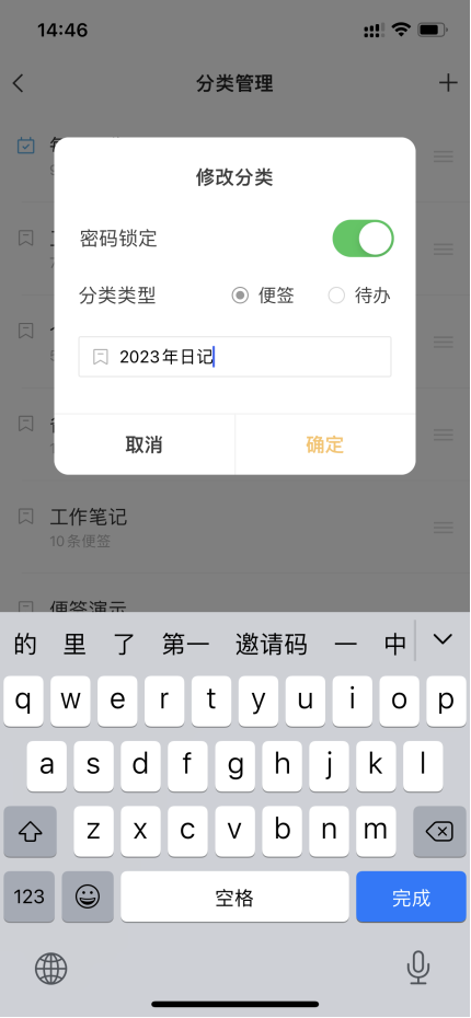 分类密码设置步骤和锁屏密码大致相同,不过由于每个分类均可加密,所以想要“开启密码锁定”需要在“分类管理”页,点击某个分类名称勾选开启。
