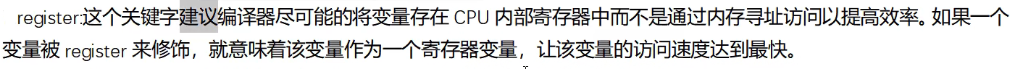 for循环中的c在每一次循环中,cpu都需要将c从内存中读取到寄存器,然后将c++之后又写回到内存中,所以访问速度相对就会慢,所以可以用register关键字建议cpu将变量c存放在寄存器中以提高访问速度。