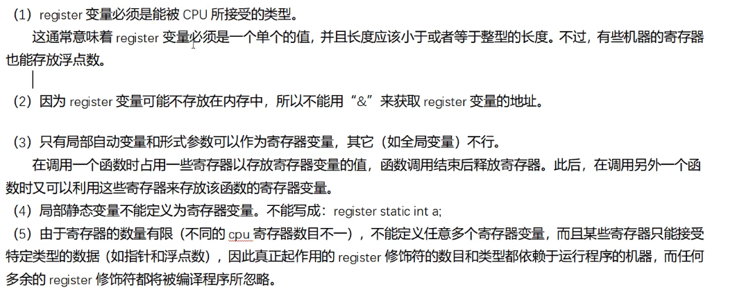 3)假如寄存器变量是全局变量,这个寄存器就会在整个程序执行中被占用,所以不能定义全局变量为寄存器变量。但是假如是局部变量(或者形参),内存空间就会在函数调用完之后释放,寄存器也就不再占用,所以可以定义为寄存器变量。