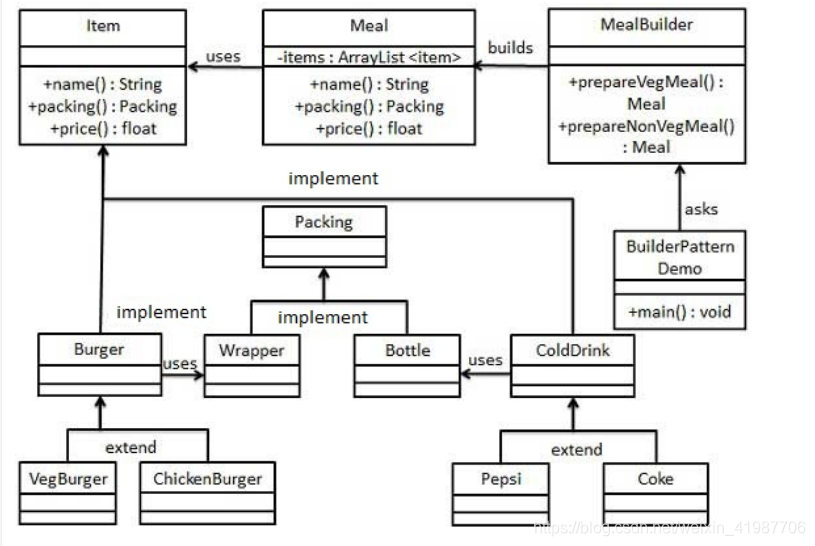 然后我们创建一个 Meal 类,带有 Item 的 ArrayList 和一个通过结合 Item 来创建不同类型的 Meal 对象的 MealBuilder。BuilderPatternDemo,我们的演示类使用 MealBuilder 来创建一个 Meal。