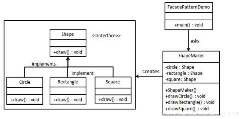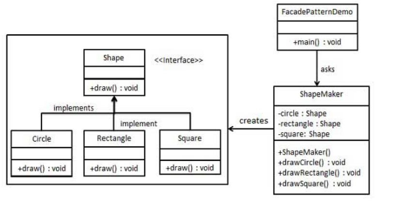 我们将创建一个 Shape 接口和实现了 Shape 接口的实体类。下一步是定义一个外观类 ShapeMaker。
