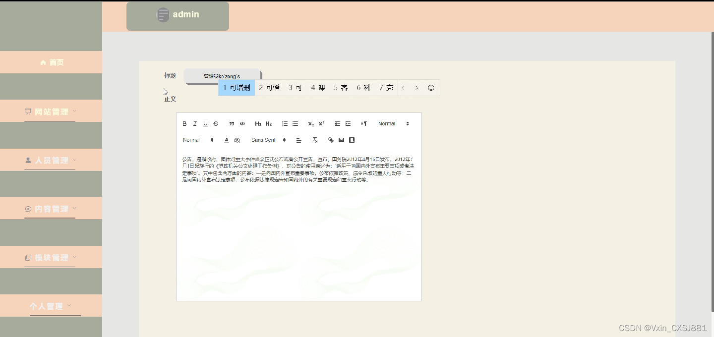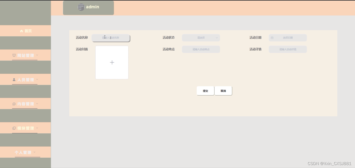 管理员登录进入首页后,可以编辑操作首页,网站管理(轮播图,公告栏),内容管理(论坛列表,论坛分类,社团资讯,资讯分类),人员管理(管理员,学生),模块管理(社团分类、社团信息、入团申请、社团成员、社团活动),个人管理等内容,如图5-2所示。