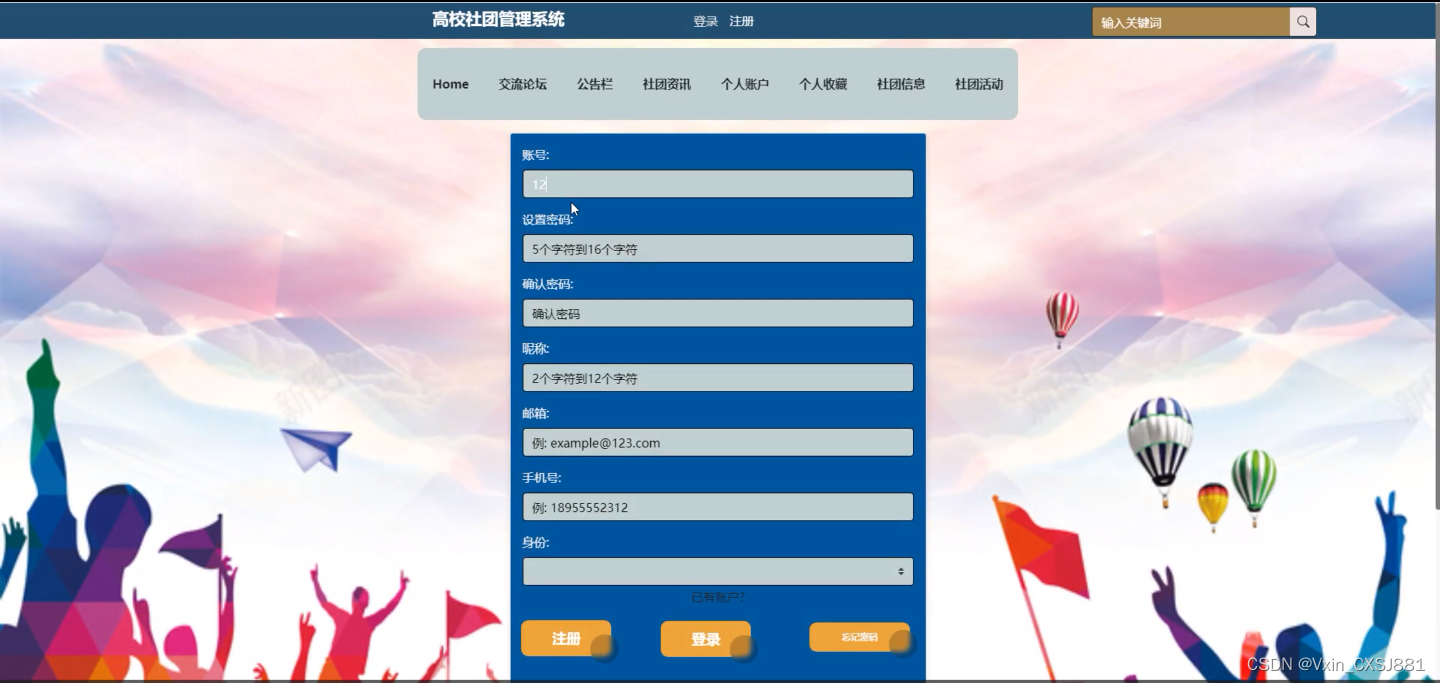 用户注册,通过填写账号、密码、昵称、邮箱、手机号、身份等信息,输入完成后选择登录即可进入高校社团管理系统,如图5-10所示。